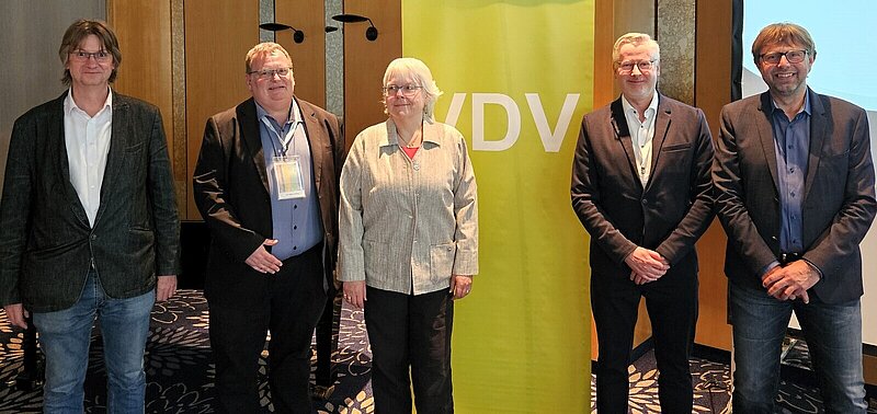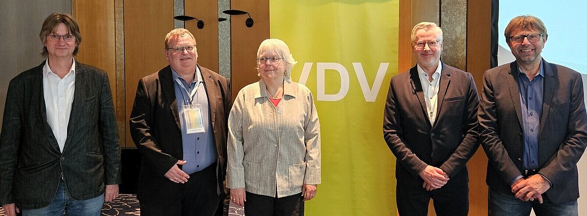 Der Vorstand des BILDUNGSWERK VDV - v. l.: Peter Landa [Fachbereichsvertreter], Rainer Kießling [Geschäftsführer]. Anke Thielisch [Schatzmeisterin], Markus Schäfer [stv. Vorsitzender] und Paul Sterzik [Vorsitzender] - Foto: Guido Baumann
